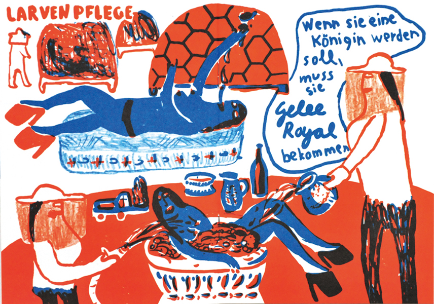 Es gibt nur einen Hochzeitsflug. Die Königin wird auf diesem Hochzeitsflug von ungefähr 16 Dronen befruchtet. Sie hebt die Samen in ihrer Samenblase auf, sie reichen für ihr ganzes Leben. In ihren besten Zeiten legt die Königin 2000 befruchtete Eier am Tag! Aus den unbefruchteten Eiern schlüpfen die Dronen. Sie kann selbst bestimmen, wenn es eine Drone werden soll. Wenn Sie keine Samen mehr hat, wird sie ausgetauscht. Die Arbeitsbienen ziehen sich dann eine neue, junge Königin. Die Königinnenlarve bekommt ganz besonderen Gelee Royal als Futter.